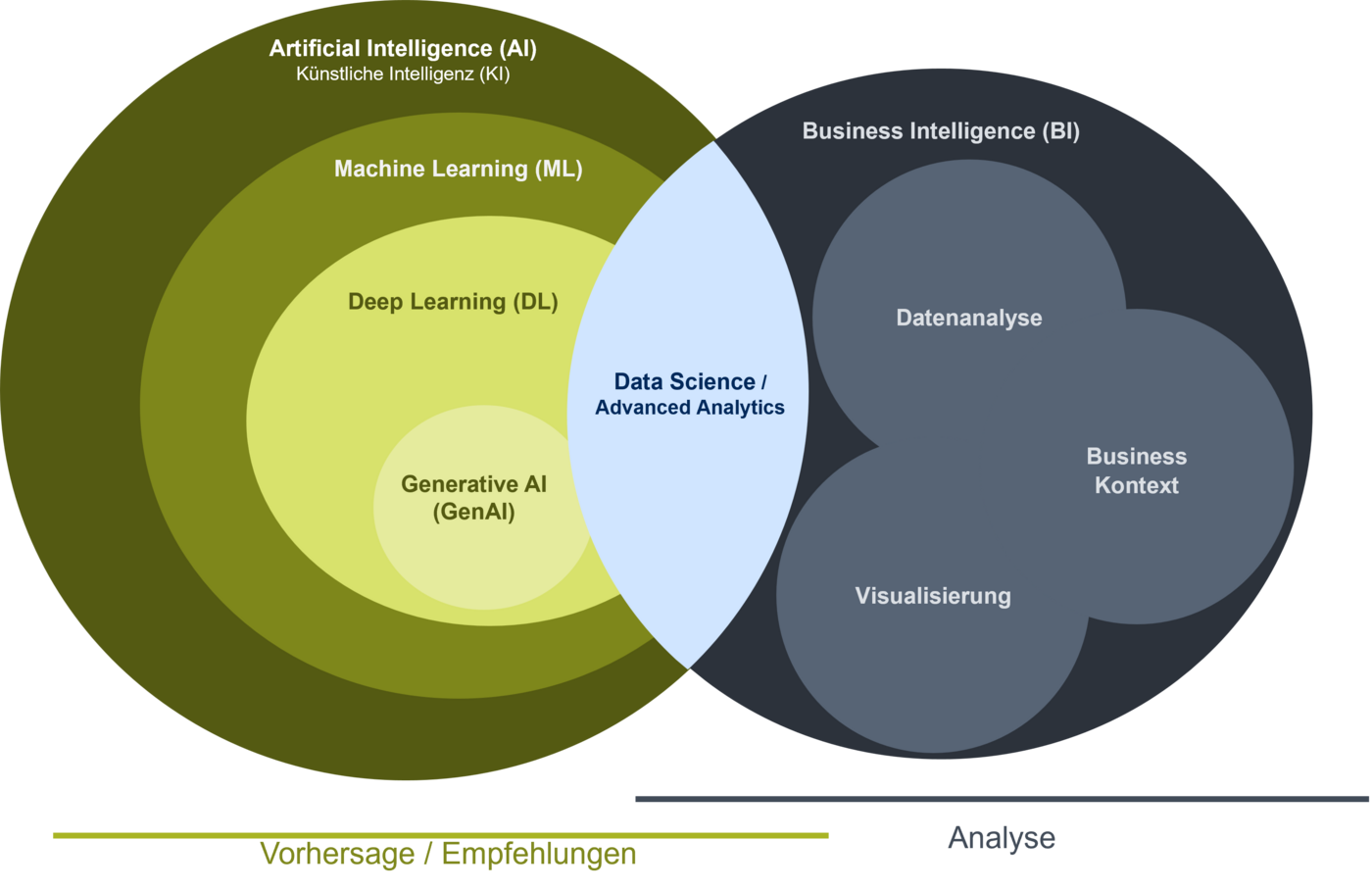 AI ist ein Überbegriff und kann sich in unterschiedlichen Formen zeigen, wobei einige Formen durch den AI-Hype heute nicht mehr unter dem Namen AI geführt werden. Konventionelle Mathematik und Statistik weist Überlappungen in die AI-Bubble auf, wobei das Grenzgebiet oft mit Advanced Analytics beschrieben wird. Abgegrenzt von AI, aber häufig die Grundlage dafür ist der Bereich der Datenanalyse und Visualisierung – Business Intelligence: