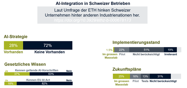 Obwohl der Hype um AI seit der Lancierung von Copilot und ChatGPT sehr gross ist, zeigen sich Schweizer Unternehmen noch eher zurückhaltend. So gibt es zwar Ansätze in der Unternehmensstrategie, jedoch ist der Stand der Implementierungen noch auf sehr geringem Niveau: